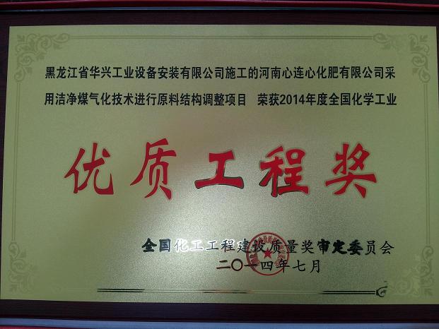 江南在线手机版(大中国区)施工的“河南心连心化肥有限公司采用洁净煤气化技术进行原料结构调整项目”荣获全国化工工程建设质量奖评审委员会颁发的2014年度全国化学工业优质工程奖。